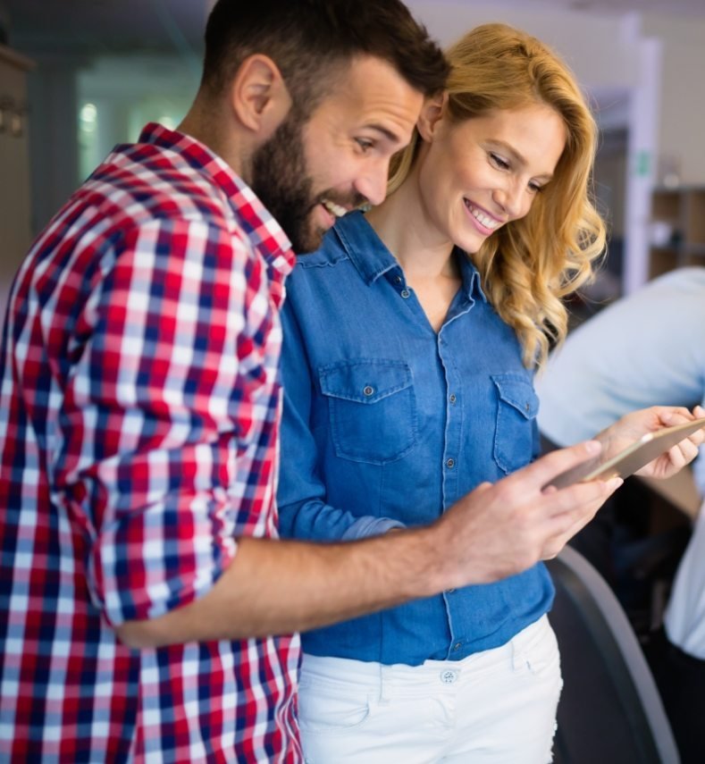 Smiling woman using a tablet to review her website design project, symbolizing creativity, digital success, and professional web design services by Dilasha Tech India Pvt Ltd.